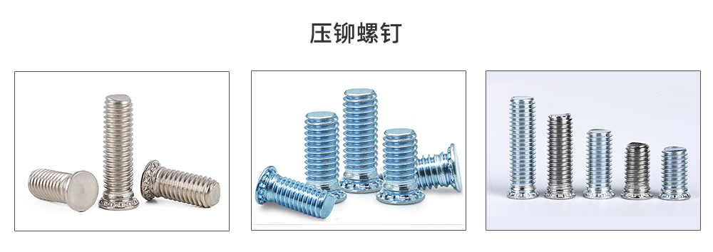 压铆螺钉应于机箱机箱钣金类的薄钣,安装简单方便。在薄板上预冲一个铆压孔将压铆螺钉插入孔内,利用冲床或压铆机施力平压头部,压铆螺钉的齿会冷嵌压入薄板内从而形成一个牢固的螺纹连接副且固定在薄板上。生产工艺:采用一次性冷墩半成品成型加工搓牙机滚牙,螺纹符合螺纹通止规要求。